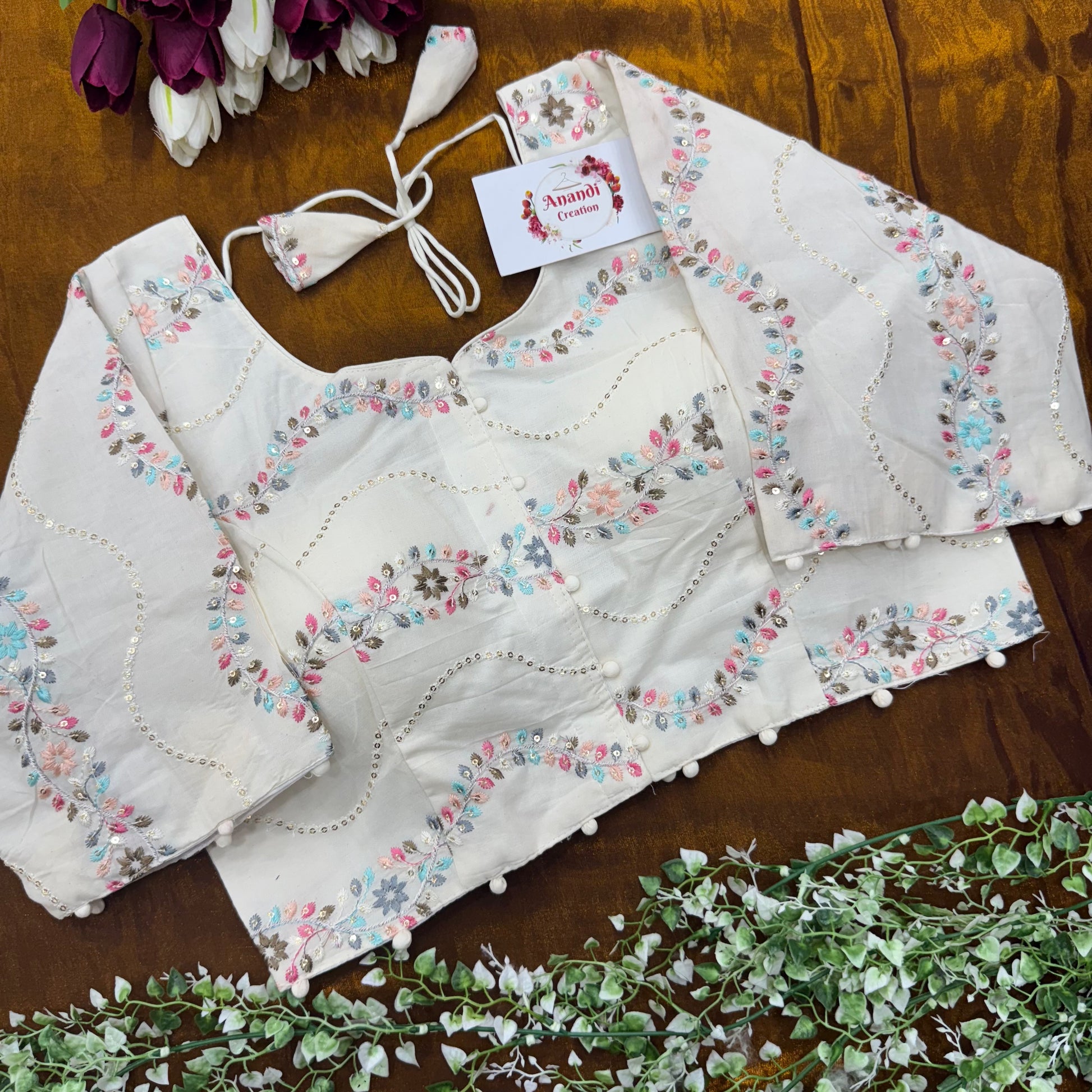 This exquisite blouse is crafted in pure khadi cotton with flower embroidery design work. Perfect for any special occasion or formal attire.