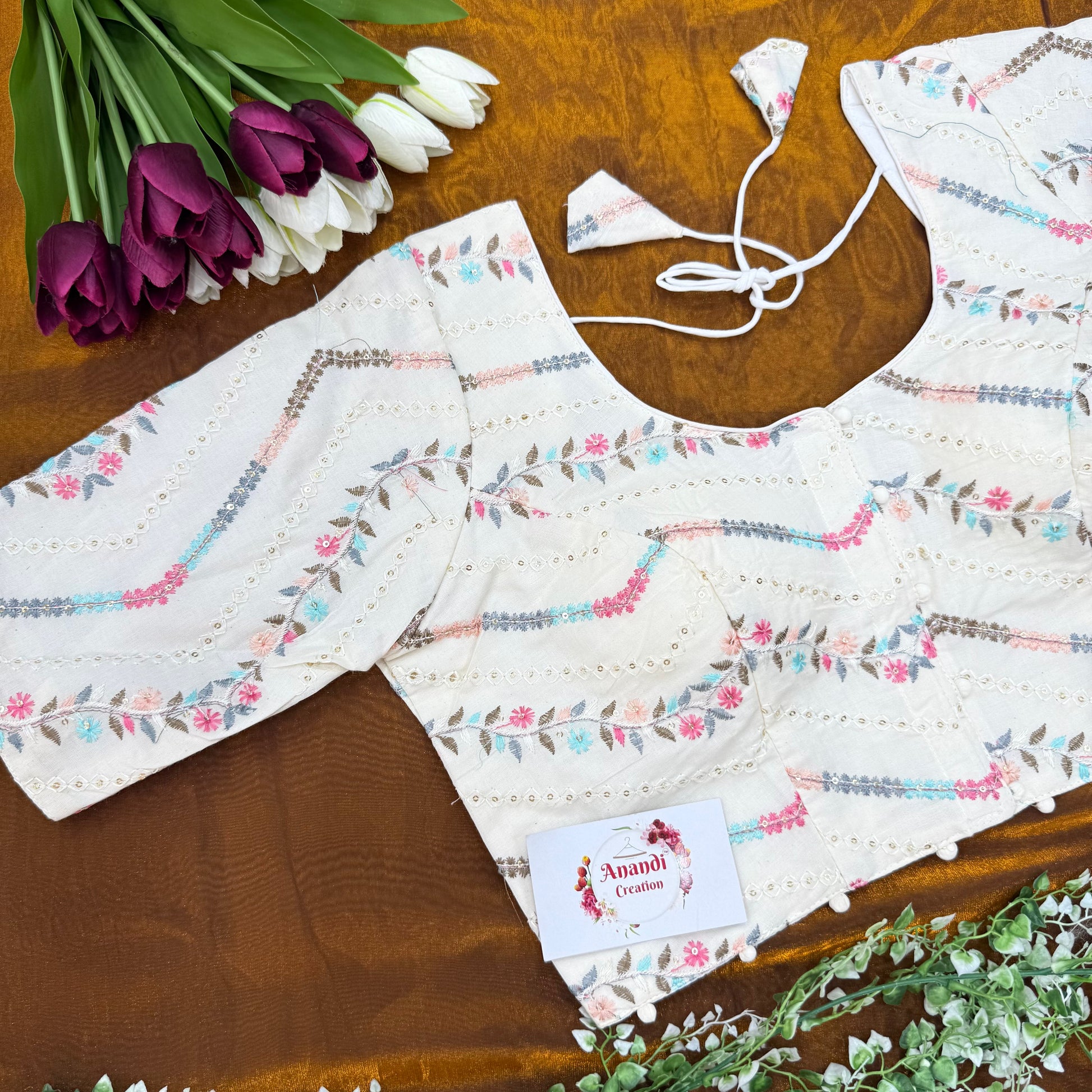 This exquisite blouse is crafted in pure khadi cotton with embroidery and sequins design work. Perfect for any special occasion or formal attire.